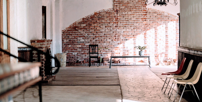 自然光が豊富に入る、カフェやレストラン、ヴィンテージ感のあるレンガ壁、木の扉、白壁などリビングなど様々なシチュエーションのあるハウススタジオ。
