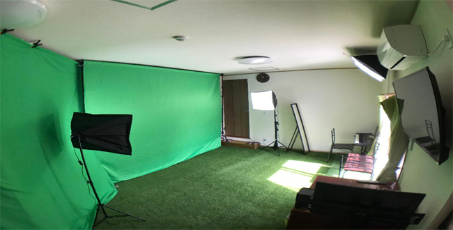 グリーンバックを広くとった室内になっています。