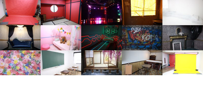 400平米を超えるフロアに様々なシチュエーションでの撮影が可能なブースを設置。