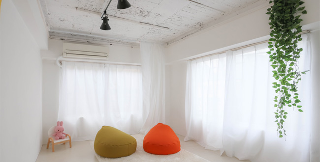 昼間は南と西の大きな二面窓から自然光が差し込み、レースのカーテンが常設。柔らかい光での撮影が可能です。