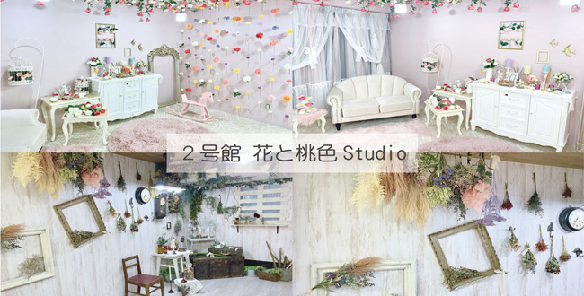 花と桃色Studioは1時間3,800円から利用できる完全貸切の撮影スタジオです。時間貸しや各種アニバーサリーフォトを行なっております。白を基調としたドライフラワーとアンティーク空間のブースとゆめかわな可愛いピンクブースと異なった2つの撮影が可能です。商標利用や動画利用にも追加料金はございません。また、さまざまなニーズにお応えしたく提供しておりますので是非ご相談下さい。