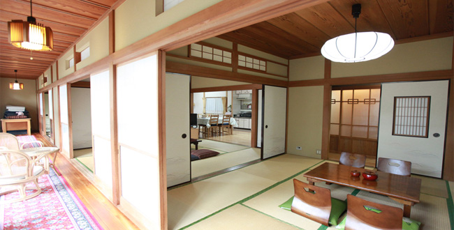 縁側から望む庭には木々の緑が美しい古き良き時代を思い起こさせる日本家屋、南向きの長い縁側と広い庭、2間続きの和室16帖とつながるLDKを含めると40帖の広々空間、そして広々旅館風の玄関と表通りから玄関までの和風の通路も撮影可能です。
