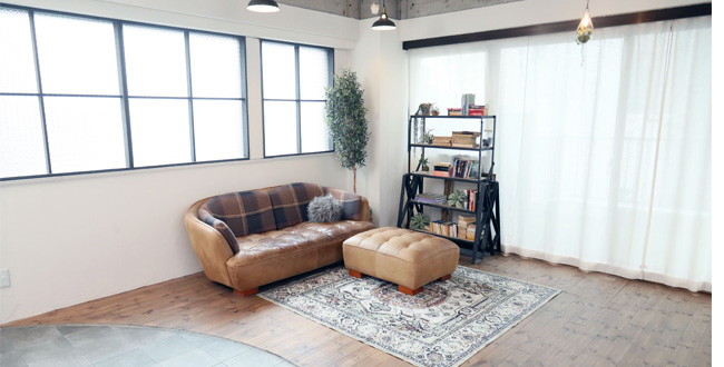 シンプルに白を基調としたシャビーシックな空間。自然光の調節がしやすく、時間帯や季節によって、ニュアンスの違いを活かした撮影が可能です。インテリアを活かしたハウスシーンの撮影や、味のある背景を利用してインタビューの撮影など、幅広い撮影でご利用いただけます。